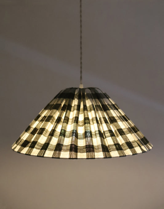 L’habillage des suspensions est plissé et cousu à la main avec soin, puis embelli de finitions rubans ou franges. La réalisation de chaque suspension représente plusieurs heures de travail.