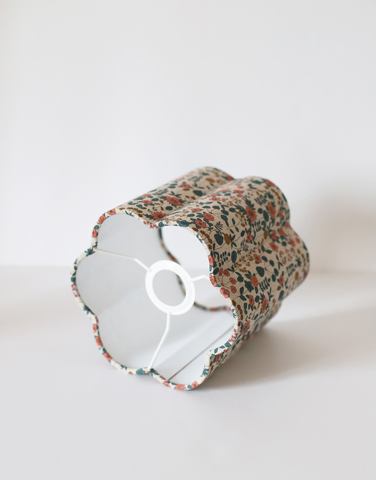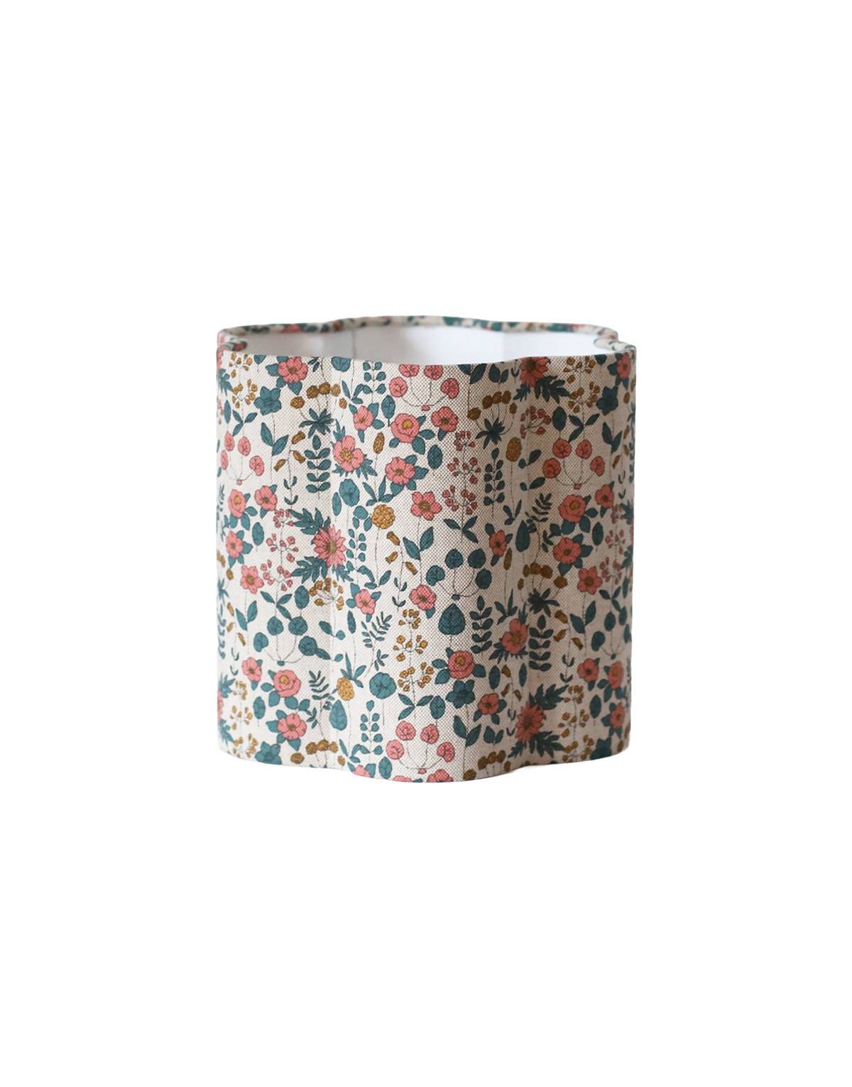 Un tissu à l'imprimé floral délicat, pour habiller cette structure aux bords festonnés qui évoquent subtilement les pétales d'une fleur. Sur un fond beige très doux, se déploie un motif riche de petites fleurs et de feuilles dans des tons harmonieux de rose, ocre et de vert forêt. Cet imprimé apporte une touche de charme bucolique et intemporel.