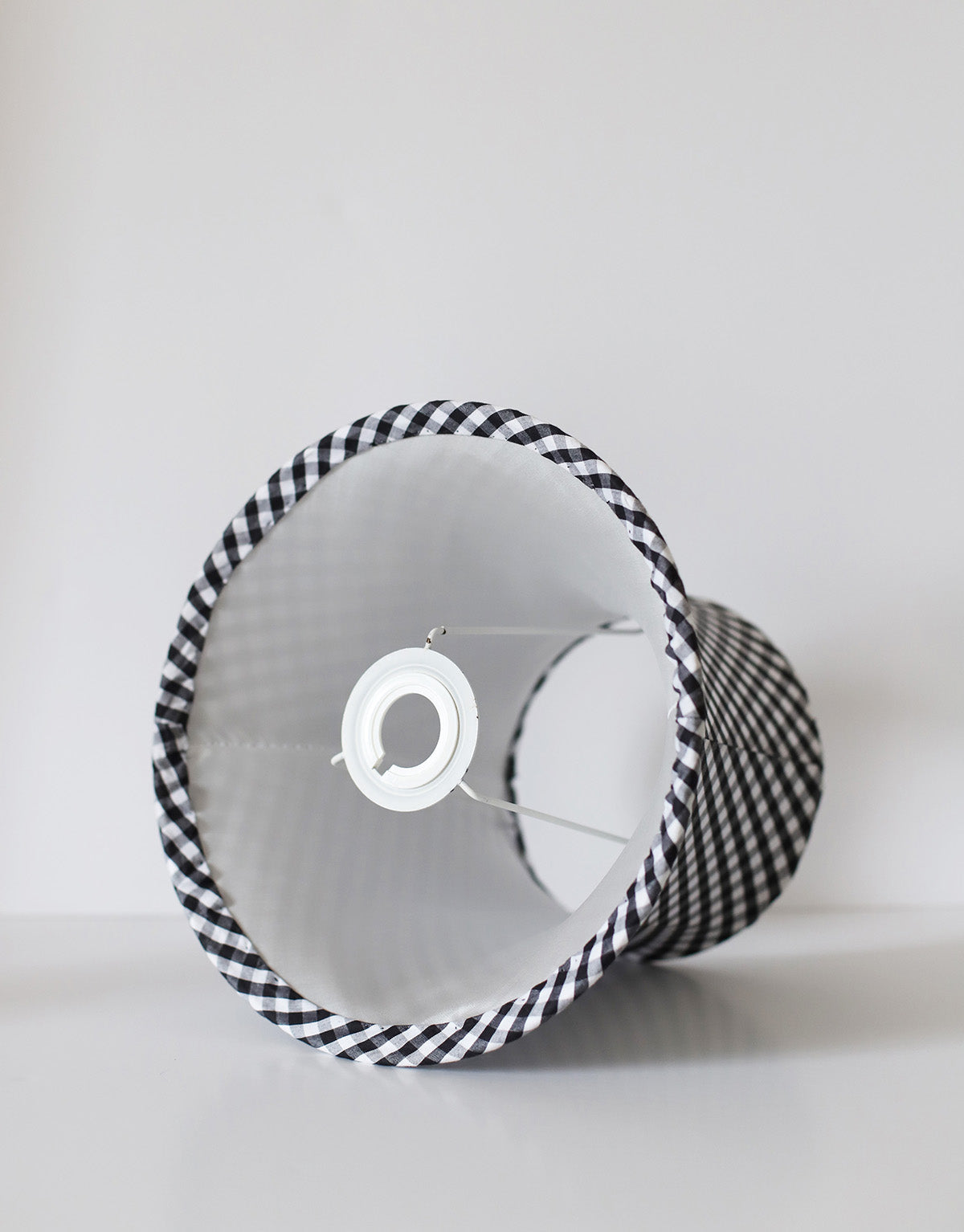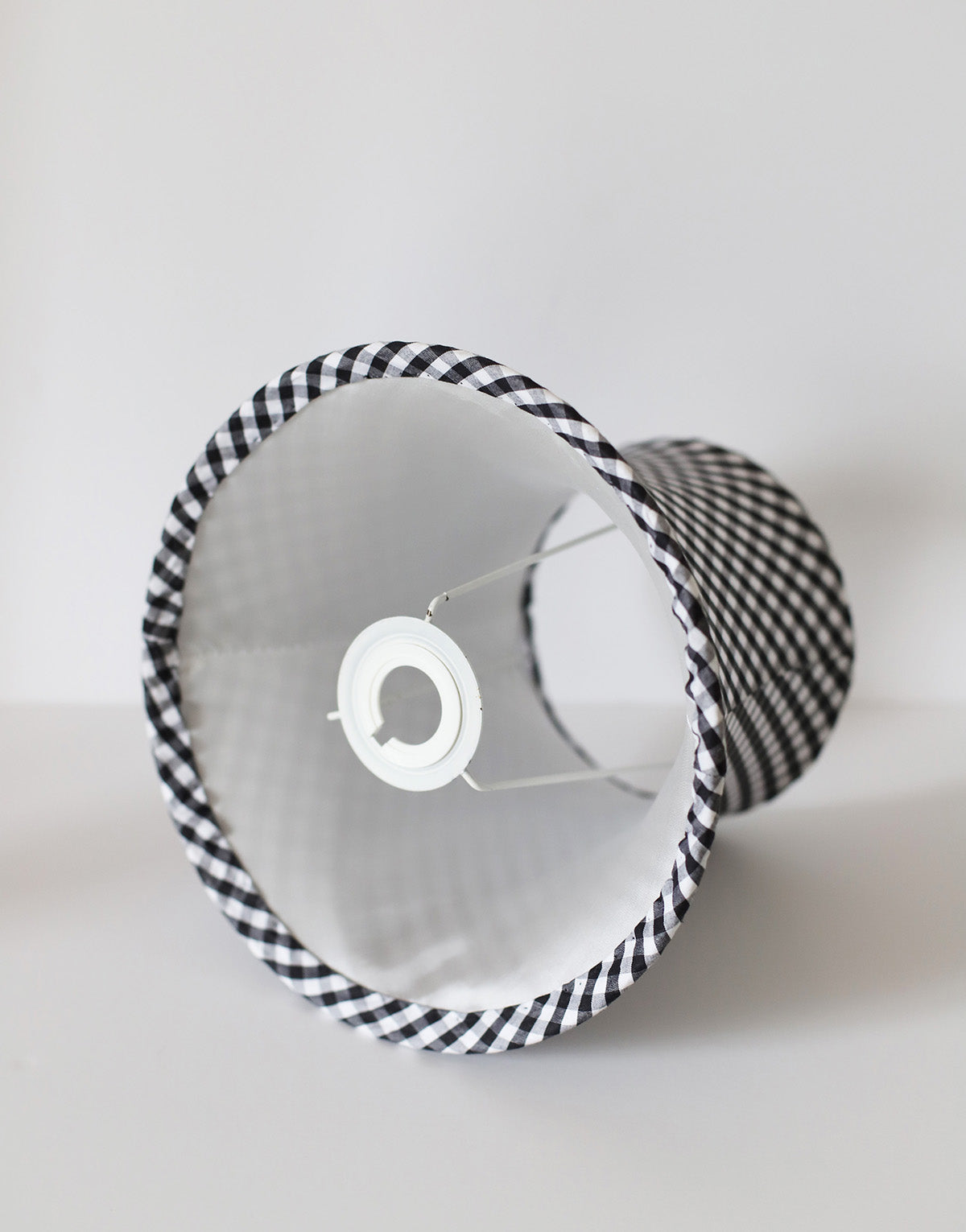 Abat-jour cousu main, forme pagode, habillage neuf, imprimé vichy noir.