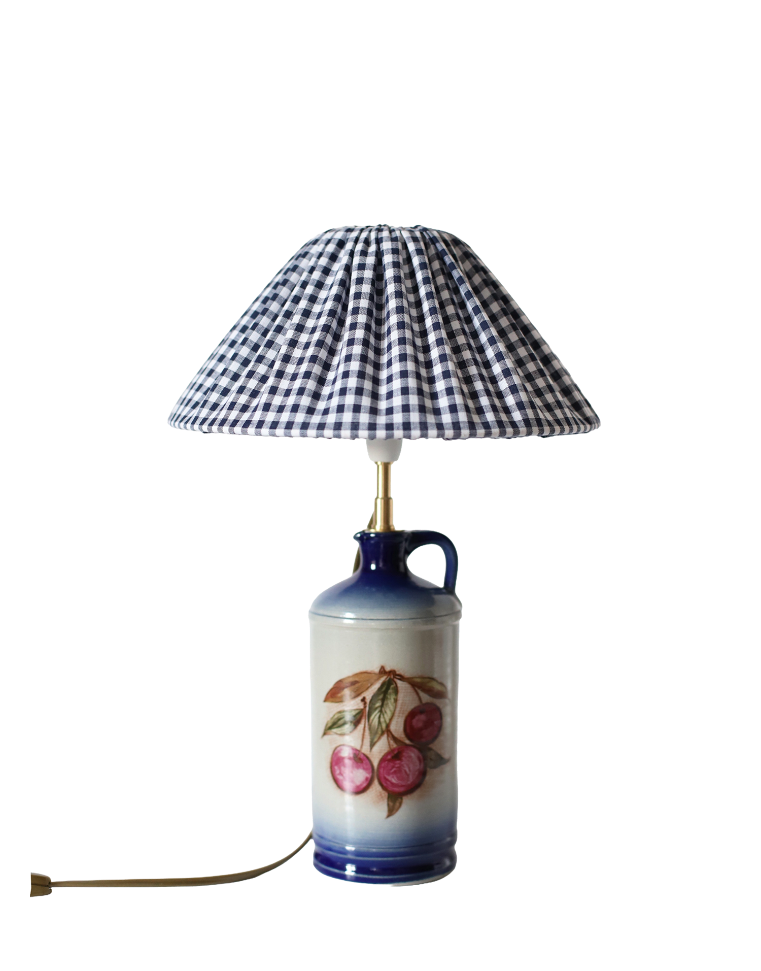 Lampe à poser vintage Hautlalampe : pied en grès d’Alsace bleu et abat-jour Vichy plissé
