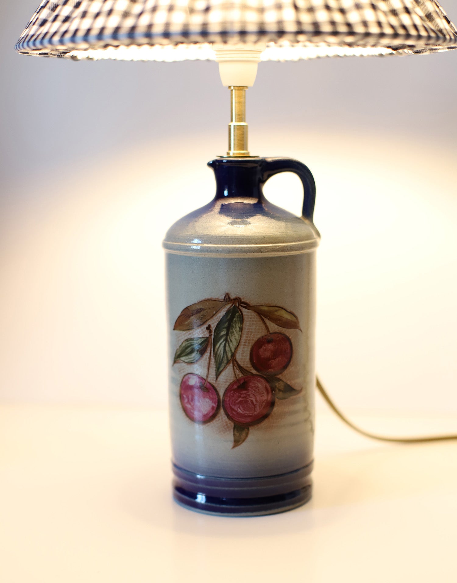 Nous avons transformé une carafe en grès typique des années 70 en une remarquable lampe. Ce travail d’upcycling préserve l’âme vintage de l’objet tout en lui offrant une nouvelle fonction déco durable.