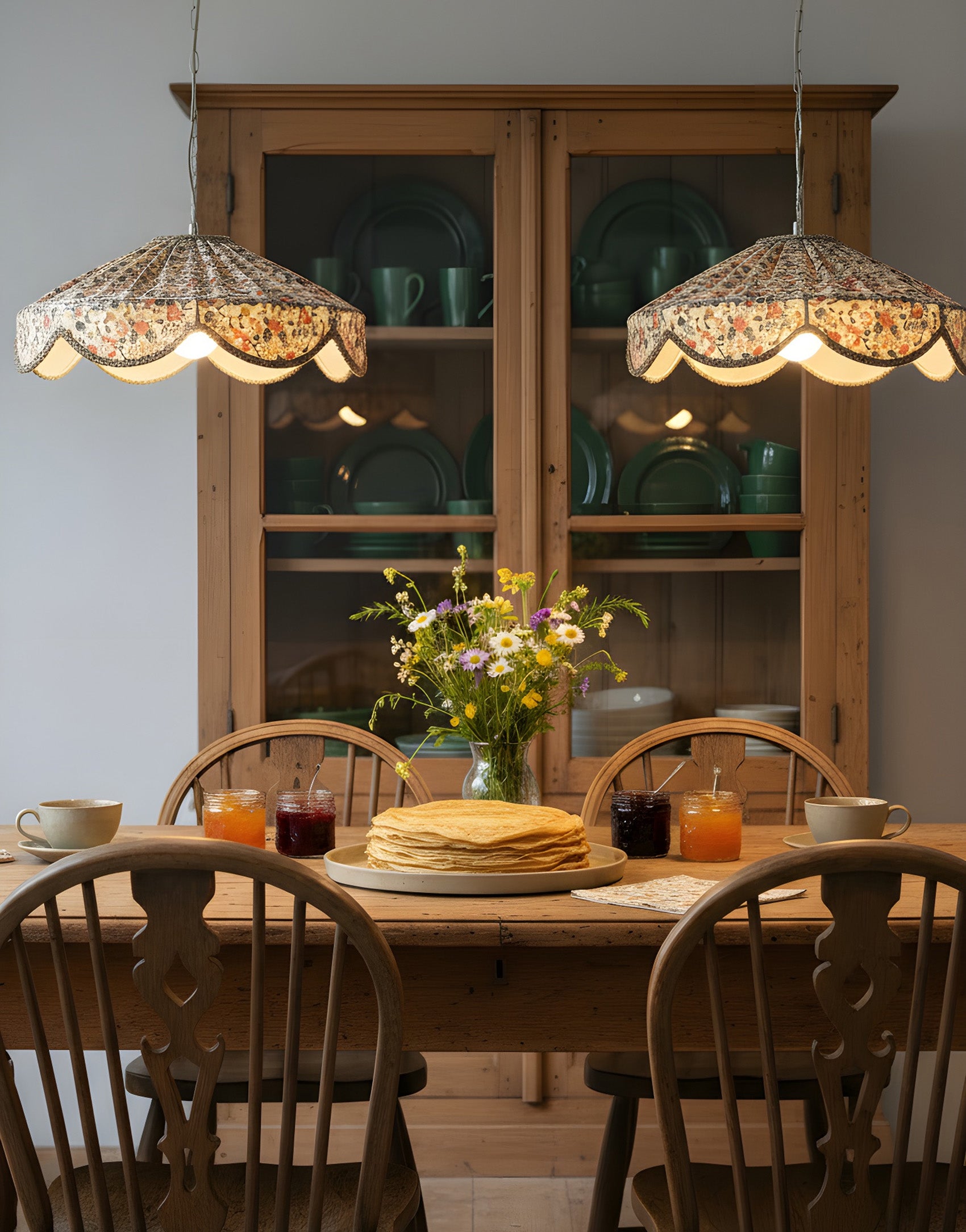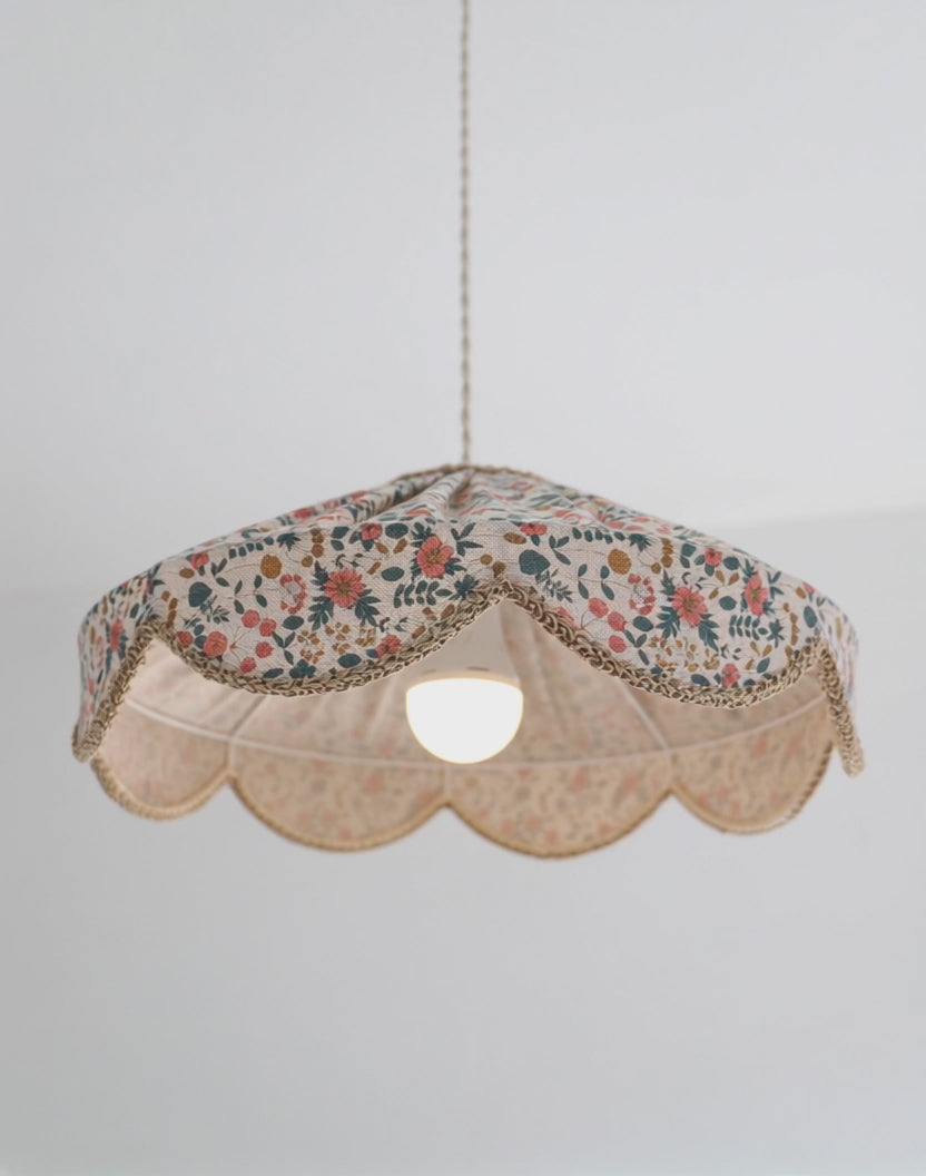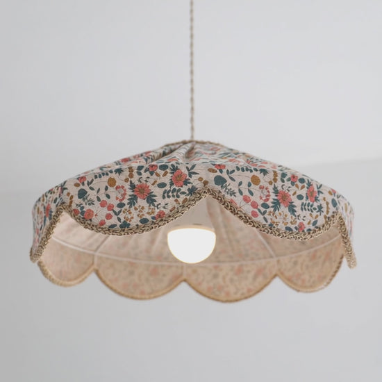 Cette suspension au motif délicat est composée d’un abat-jour rond d'inspiration florale, habillé d’une toile de coton imprimée de petites fleurs multicolores sur fond lin et garnie de rubans assortis. Plissé et cousu à la main le tissu épouse parfaitement la suspension alliant charme intemporel et authenticité. Elle s’intègrera parfaitement dans une salle à manger, une chambre ou un coin détente, créant une atmosphère chaleureuse et accueillante.